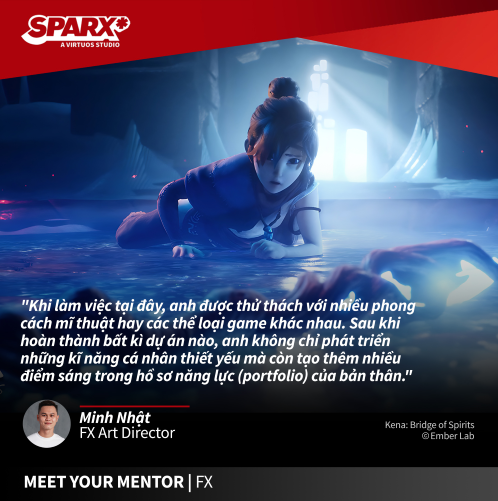 Bắt đầu từ 10 năm trước ở vị trí trainee tại Sparx*, anh Nhật đã tìm thấy niềm đam mê thực sự của mình trong lĩnh vực VFX cho game và phim. Anh đã quản lý và hướng dẫn đội ngũ VFX trong nhiều dự án game đáng mơ ước như SMITE, Demon’s Souls hay League of Legends cùng các bộ phim của Hollywood như series Star Wars Rebels hay Teenage Mutant Ninja Turtles. Bên cạnh đó, anh Nhật còn phụ trách việc giảng dạy và cố vấn cho các bạn trainee những kĩ năng cần thiết trước khi bước vào thế giới sản xuất.