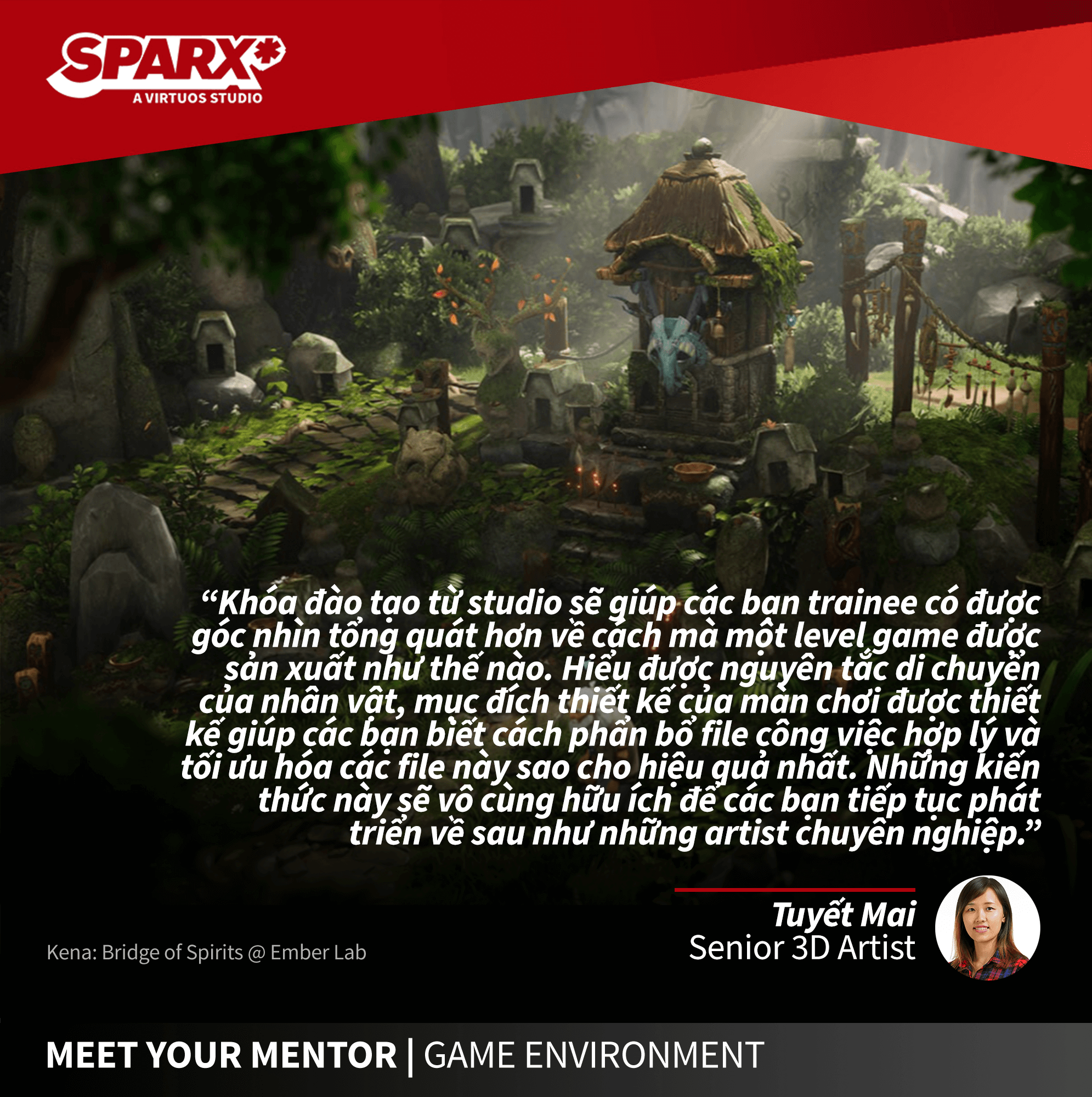 Trong số này, chúng ta sẽ gặp gỡ chị Tuyết Mai, Senior 3D Artist của bộ phận Game Environment tại Sparx*. Chị đã từng tham gia nhiều dự án nổi tiếng như Call of Duty Black Ops 3 & 4, Valorant, mới đây nhất là Kena: Bridge of Spirit và The Quarry.